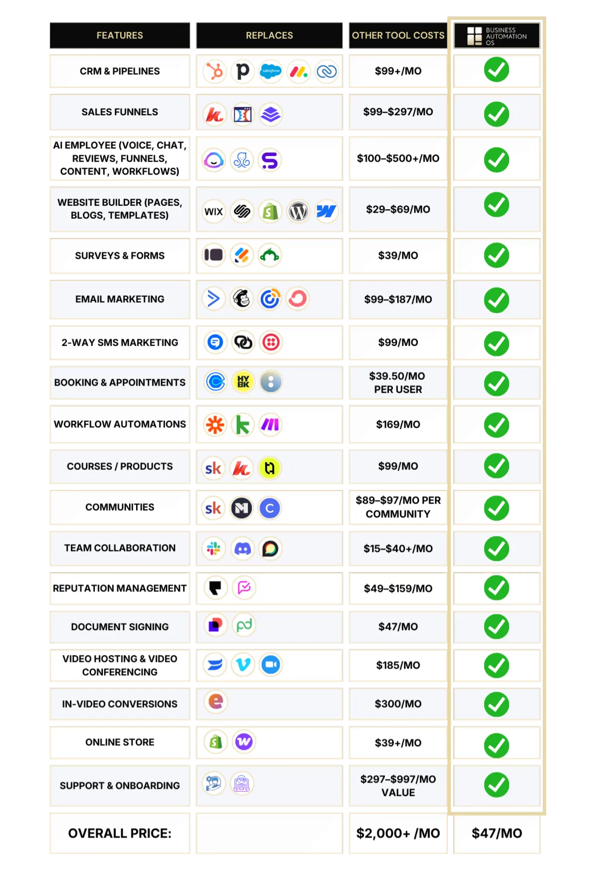 Most customers go from paying $200-$500/month in platform fees across 6-10 tools down to a single $47/month platform fee.